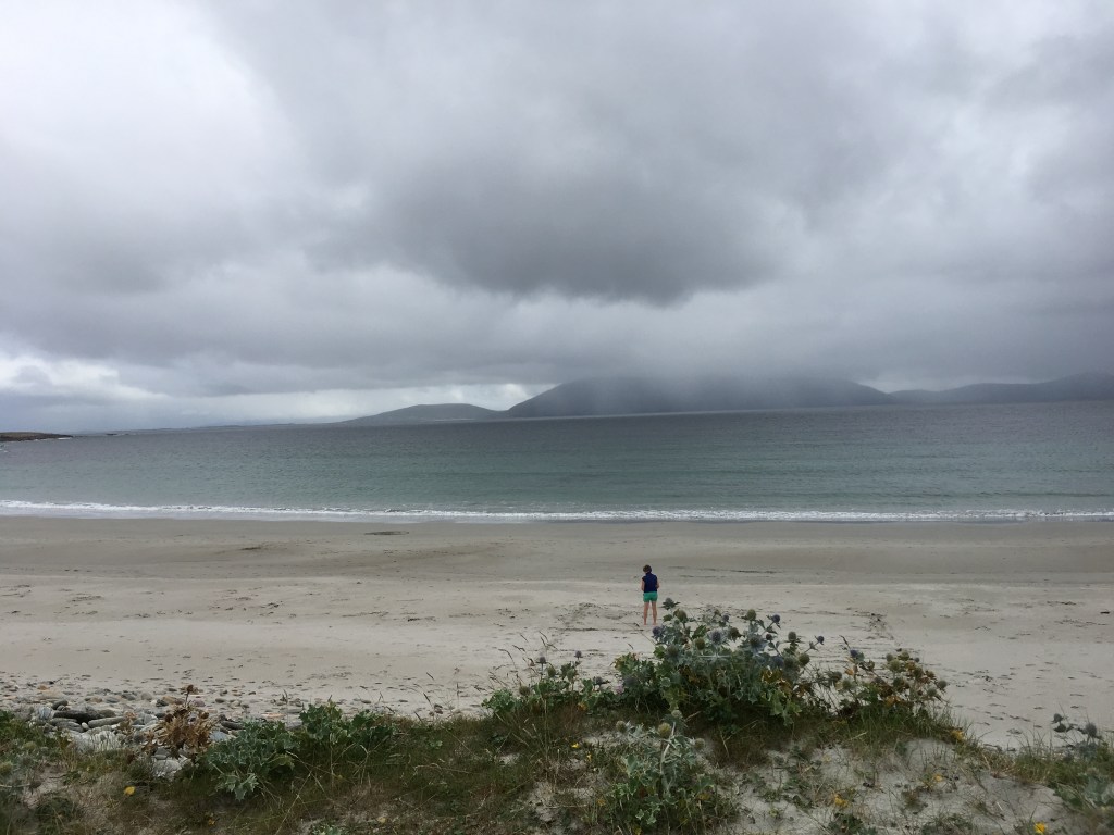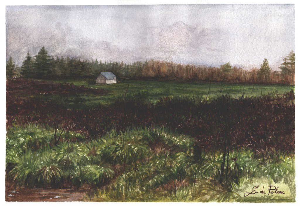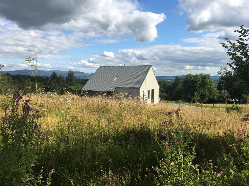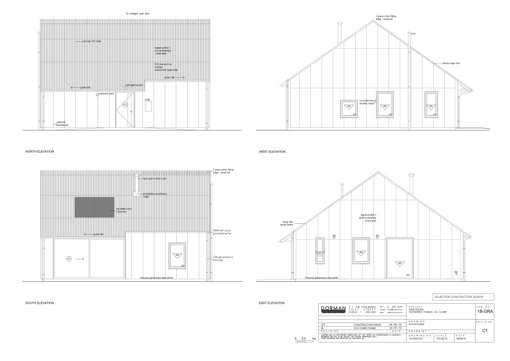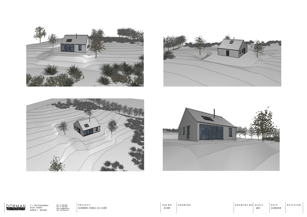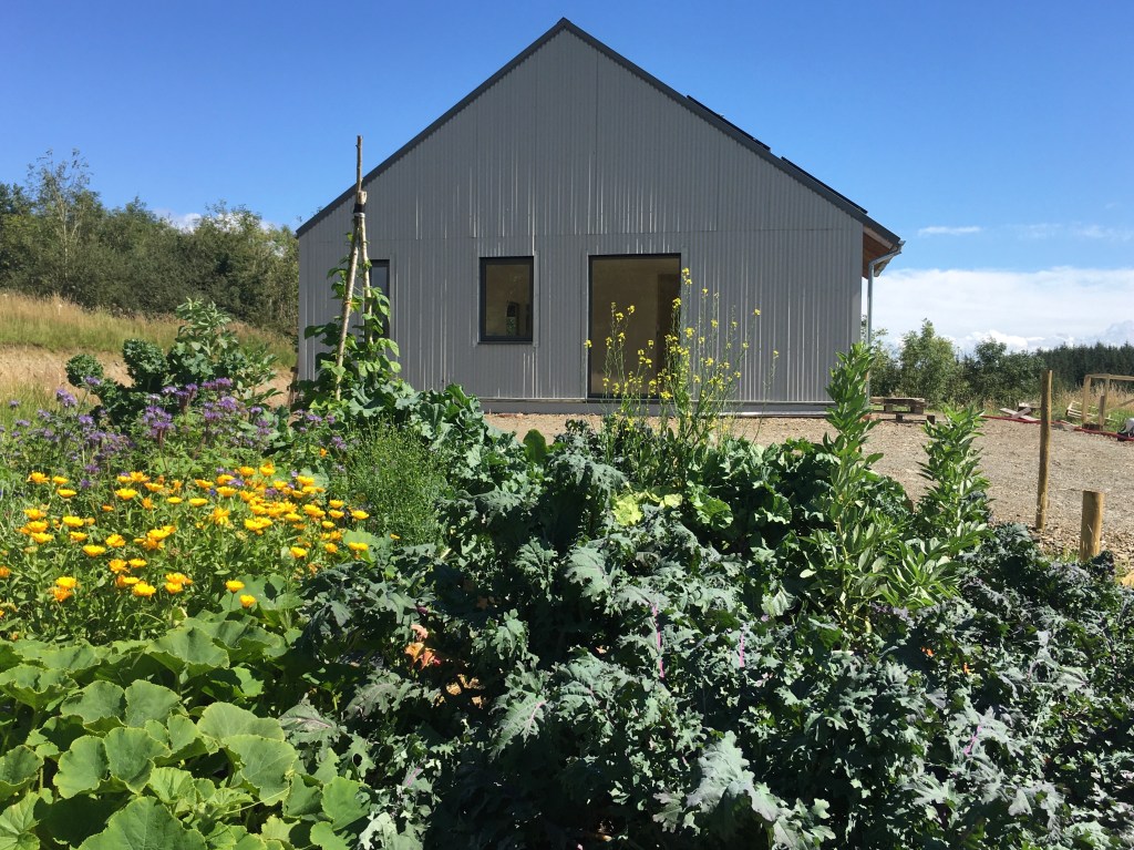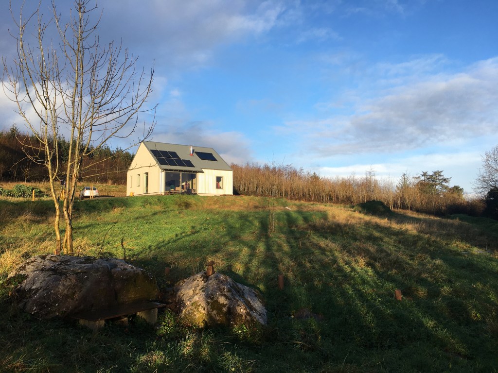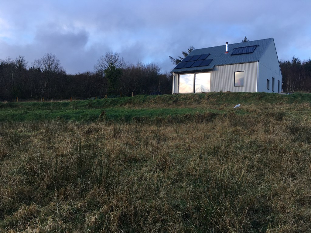 A compact timber frame house with metal clad roof and walls on a gentle sloping south facing field in east County Clare.