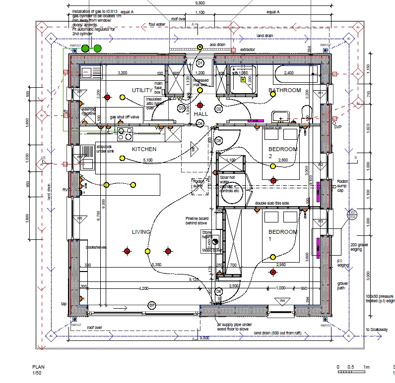 An A2 rated house designed for a self-builder who wanted to build with little fuss and cost using sustainable materials of low embodied energy and when built would require minimal energy input and provide maximum comfort. Sitting on a passive raft the house is constructed using a prefabricated timber frame structure, its walls filled with 300mm of cellulose insulation and 400mm in the roof.