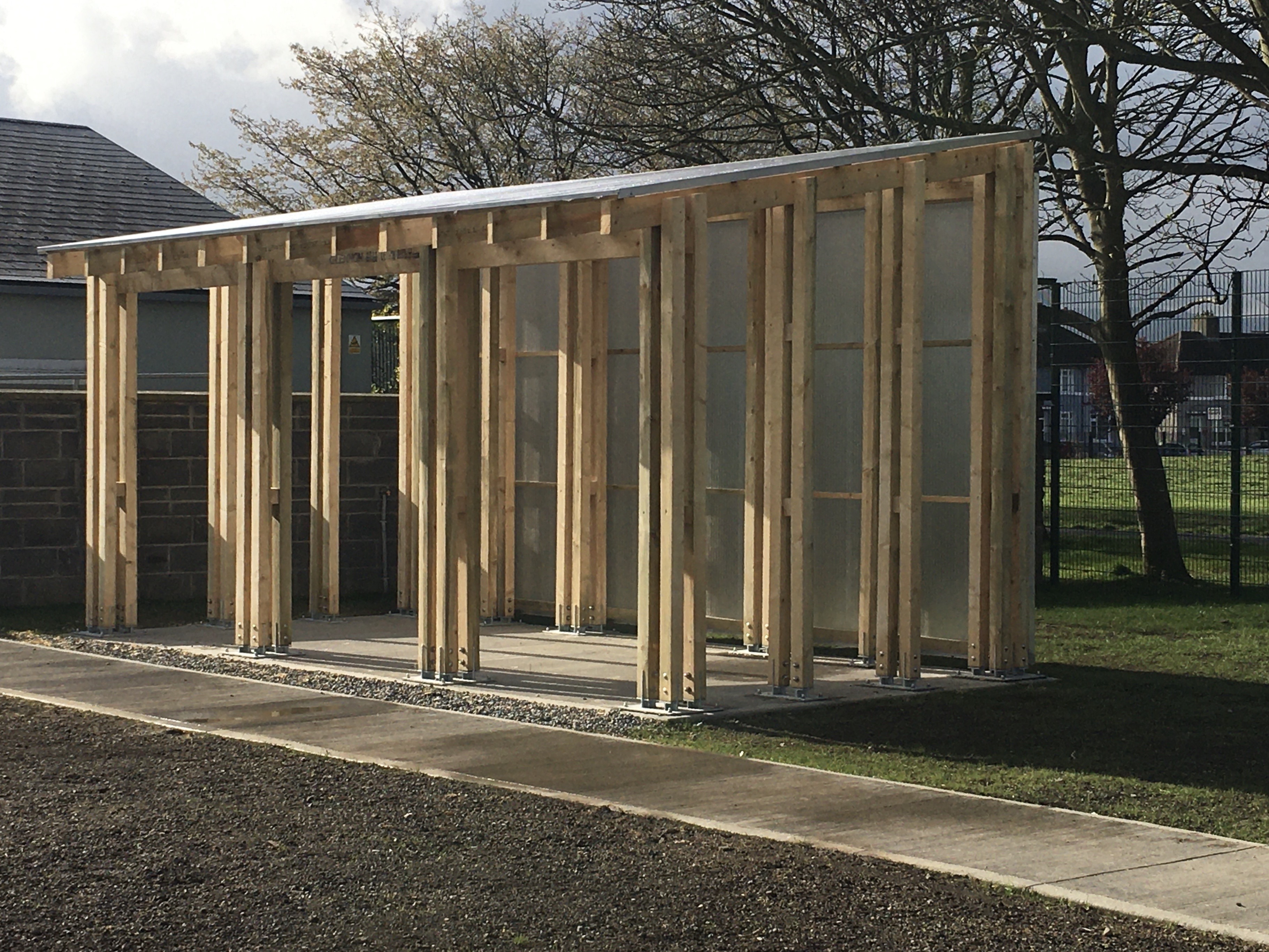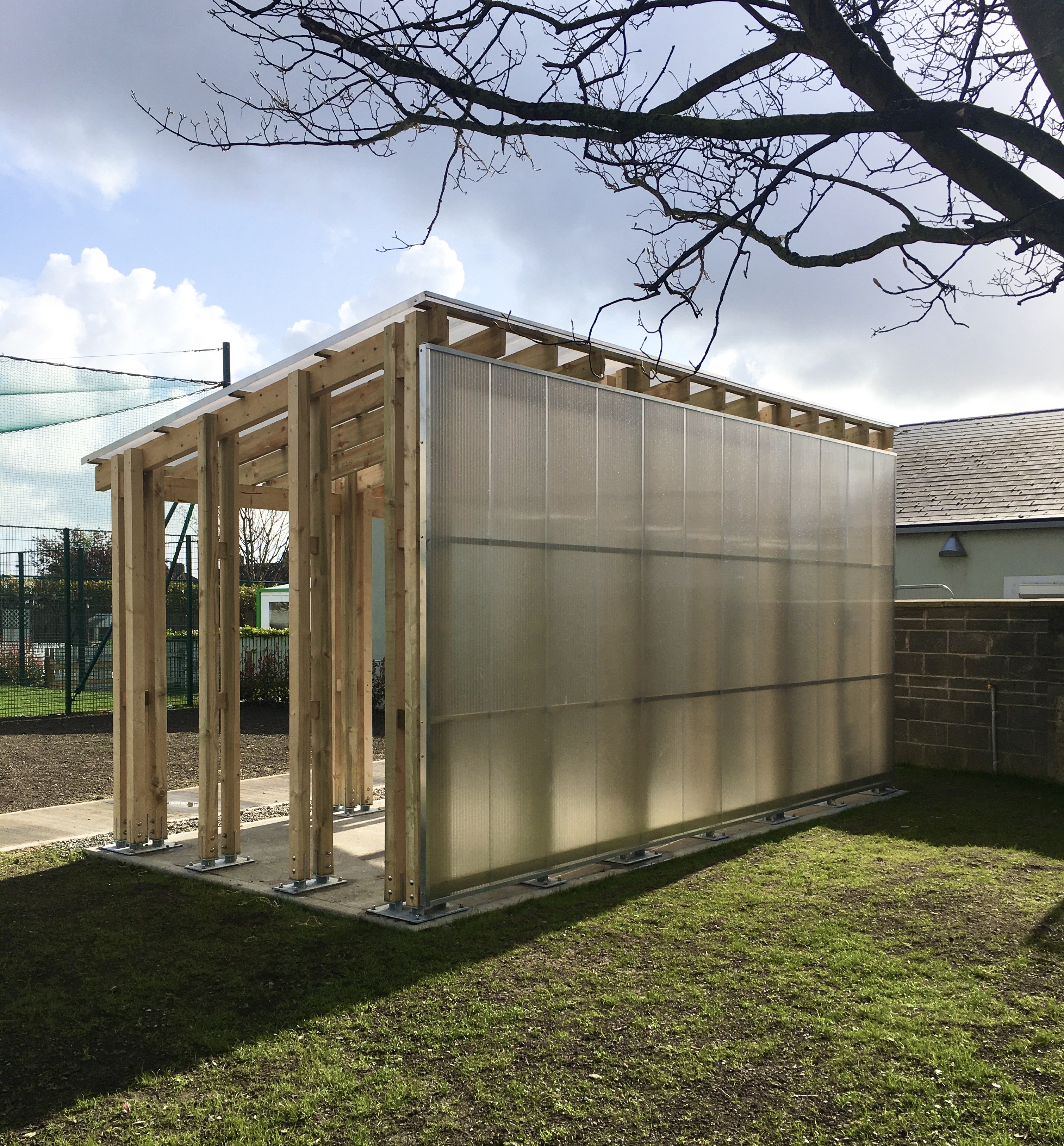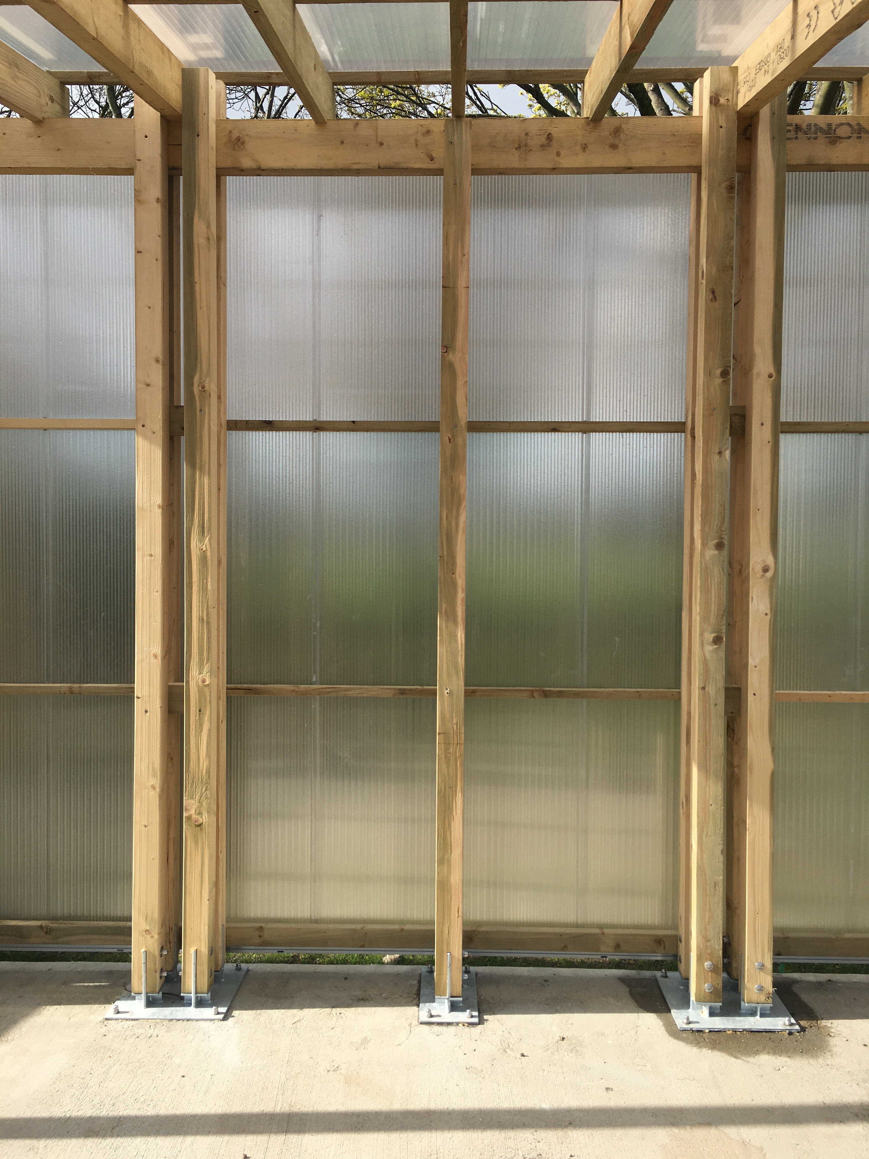 The structure comprises 100 x100 treated timbers grouped in clusters of 4 or 2 fixed into the ground with galvanised steel plates. The roof members and purlins sit into the gaps between the posts and are through bolted. The roof and back wall is sheeted with polycarbonate sheeting providing shelter from the prevailing winds and rain.