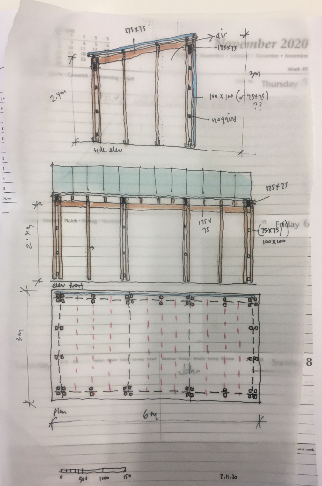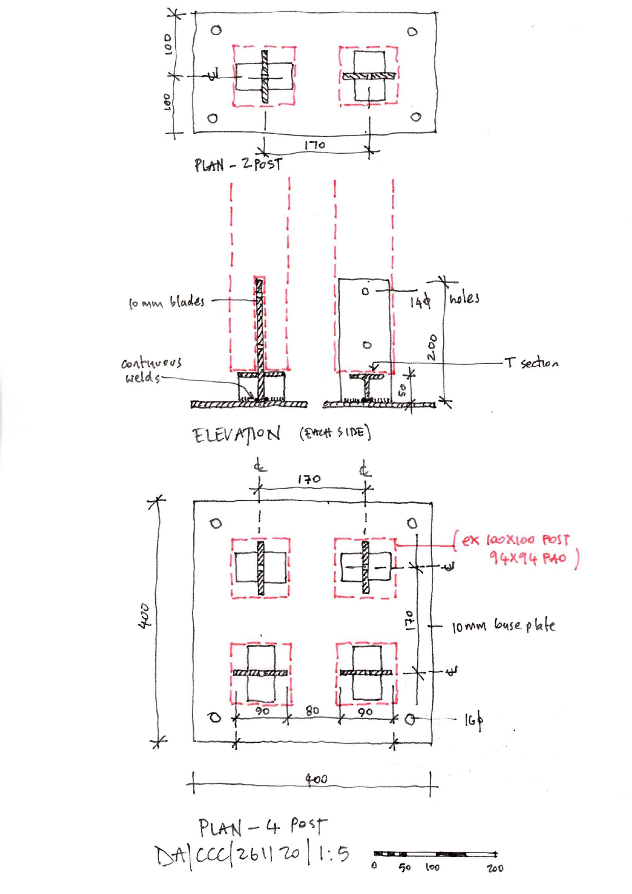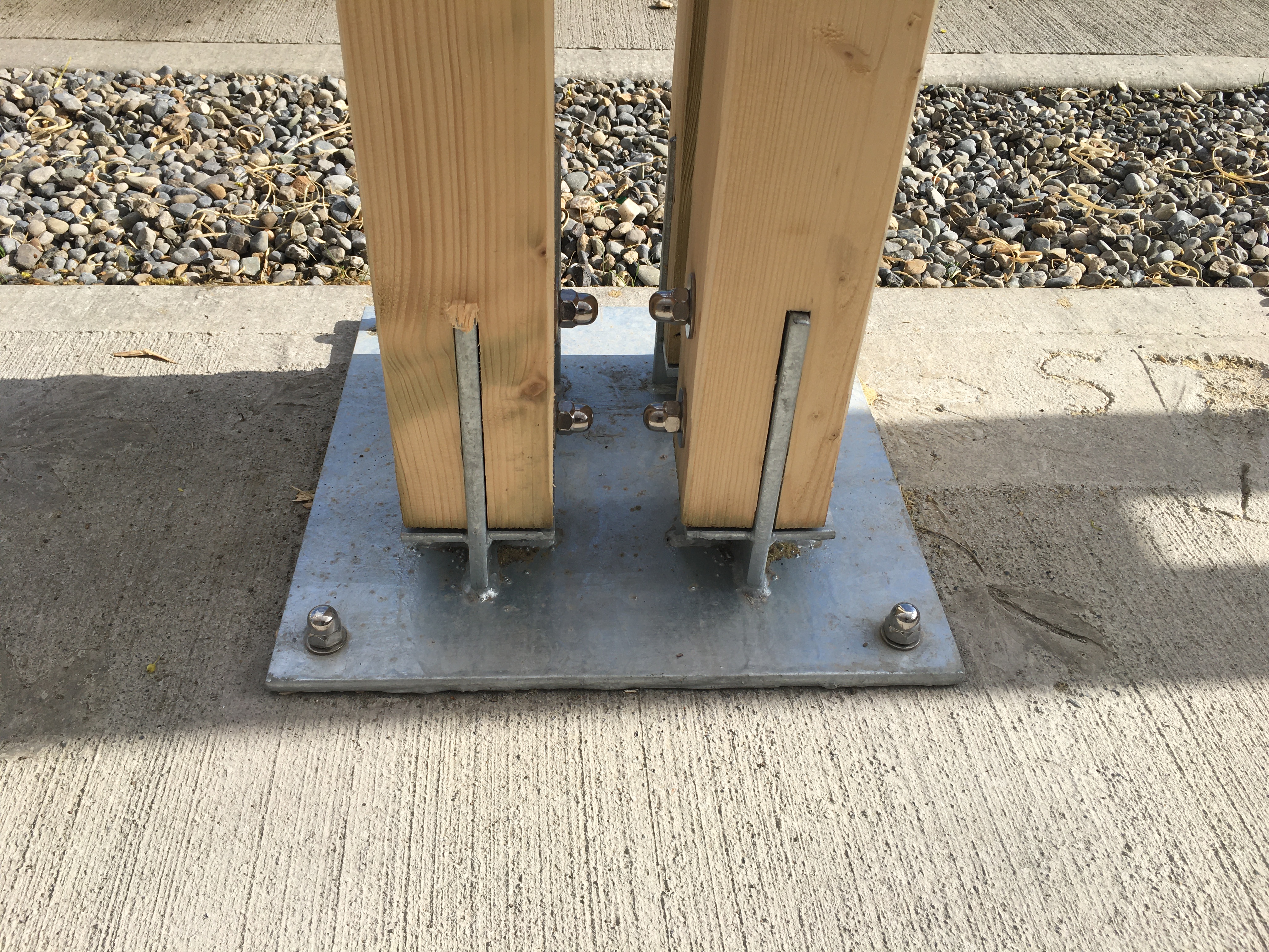 The structure comprises 100 x100 treated timbers grouped in clusters of 4 or 2 fixed into the ground with galvanised steel plates. The roof members and purlins sit into the gaps between the posts and are through bolted. The roof and back wall is sheeted with polycarbonate sheeting providing shelter from the prevailing winds and rain.
