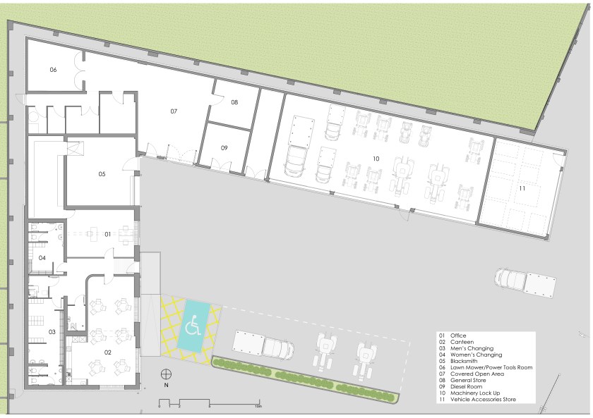 The existing depot building on the site had been extended in a piecemeal manner over a number of decades and was universally accessible, energy inefficient and of insufficient size to allow for the increase of staff and machinery. The existing building was extended at either end and wrapped around two sides of the main yard with the accommodation along one side and perpendicular to that the main machinery storage building with the various storage rooms and blacksmith at the building knuckle.