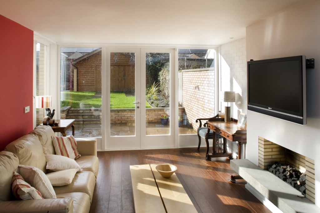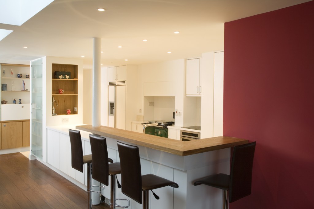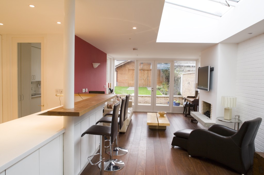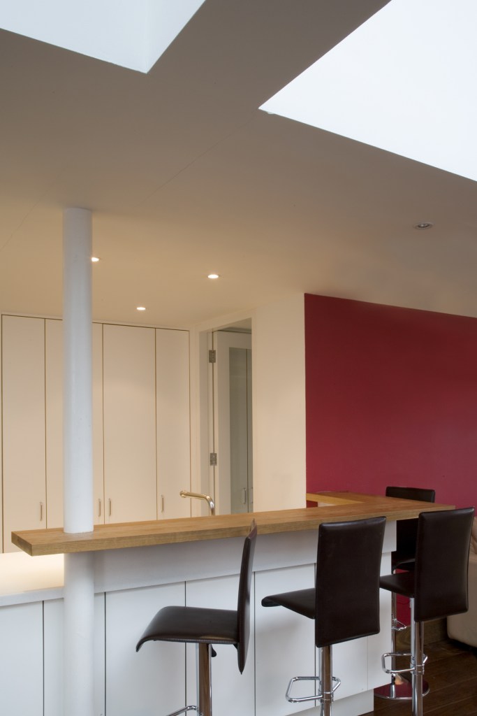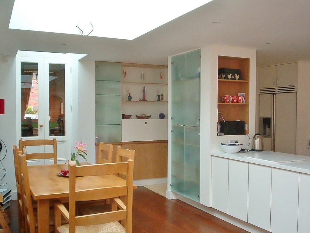 Phase I carried out in the late 1980’s converted the house from multiple flats to a single-family house. 17 years and 5 children later the house had become claustrophobic with its small crowded kitchen/dining room and single bathroom. The final phase extended sideways into the side passage and out into the garden to created a large bright contemporary kitchen/dining/family room with bedroom and bathroom above, utility behind. Teens hang out in the depth of the house.