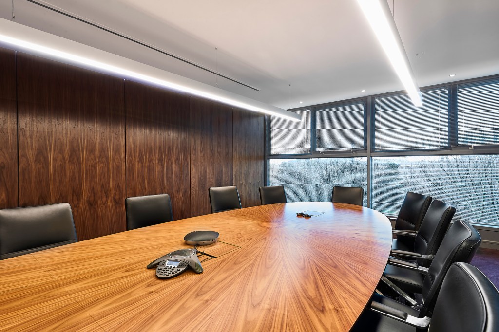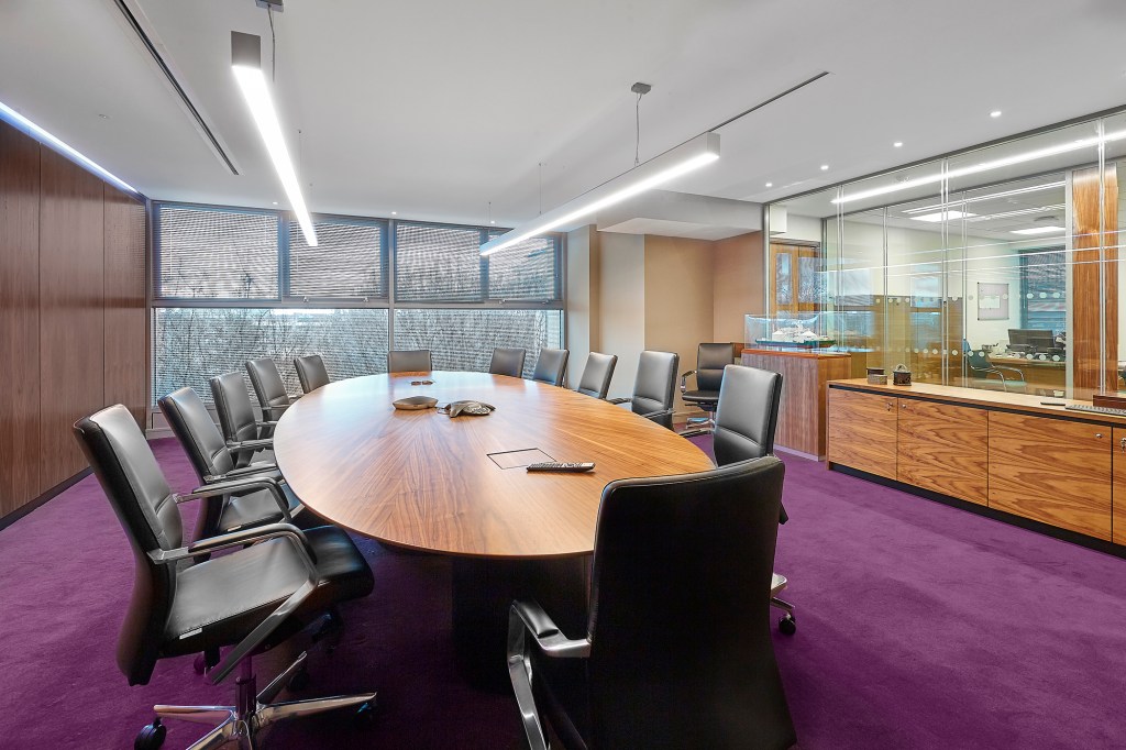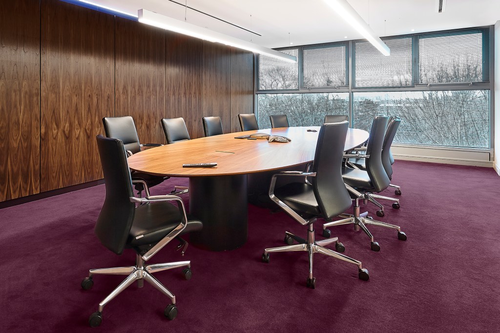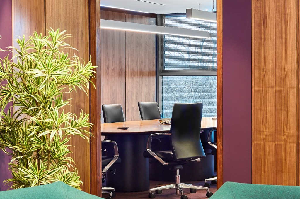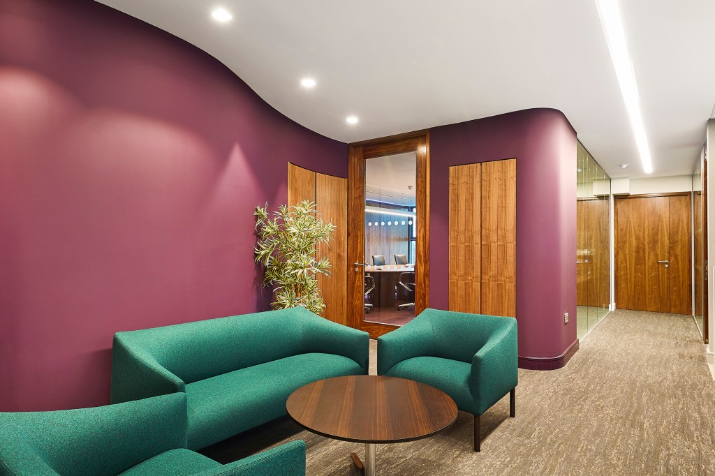 The existing office was stripped back to the bare essentials allowing for the transformation of the 4th floor offices into a corporate HQ. The key elements to this fit-out were: placing the reception and large open plan office along the south elevation opening onto the large outdoor terrace; at either end the executive cellular offices; from the open plan looking back to the city are the meeting rooms and canteen; to the east the boardroom overlooking the leafy Iveagh Gardens; ancillary areas are arrayed around the core. Key to the success of this project was engaging with the client user from the concept stage right down to the furniture selection. Natural light and a comfortable working environment were to the fore. Fully glazed partitions combined with the careful selection of materials, finishes and furniture ensured we met our client’s requirements and perhaps exceeded their expectations. The backdrop to the reception is formed by a curved rich port coloured wall interrupted by walnut doors; a single forest green column alludes to the company’s corporate colour. This combination of rich colours and walnut finishes carries through to the boardroom with its veneered panelled back wall, the beautifully crafted walnut veneered table and a port coloured wool carpet lend an air of gravitas to the board room.
