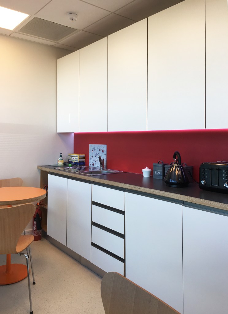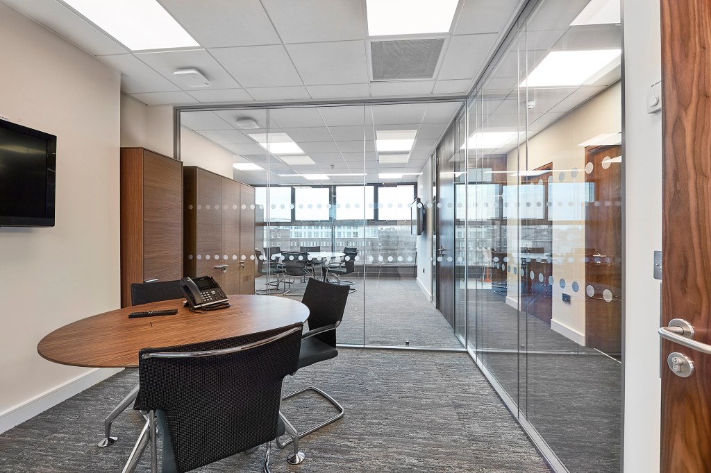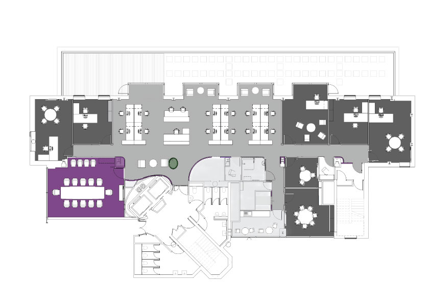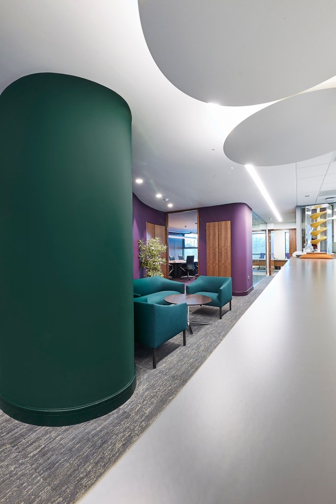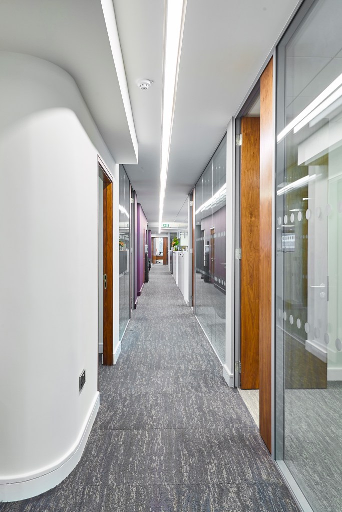 The existing office was stripped back to the bare essentials allowing for the transformation of the 4th floor offices into a corporate HQ. The key elements to this fit-out were: placing the reception and large open plan office along the south elevation opening onto the large outdoor terrace; at either end the executive cellular offices; from the open plan looking back to the city are the meeting rooms and canteen; to the east the boardroom overlooking the leafy Iveagh Gardens; ancillary areas are arrayed around the core. Key to the success of this project was engaging with the client user from the concept stage right down to the furniture selection. Natural light and a comfortable working environment were to the fore. Fully glazed partitions combined with the careful selection of materials, finishes and furniture ensured we met our client’s requirements and perhaps exceeded their expectations. The backdrop to the reception is formed by a curved rich port coloured wall interrupted by walnut doors; a single forest green column alludes to the company’s corporate colour. This combination of rich colours and walnut finishes carries through to the boardroom with its veneered panelled back wall, the beautifully crafted walnut veneered table and a port coloured wool carpet lend an air of gravitas to the board room.
