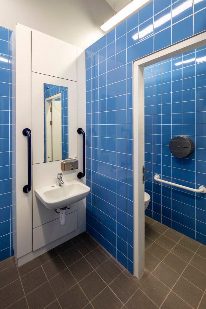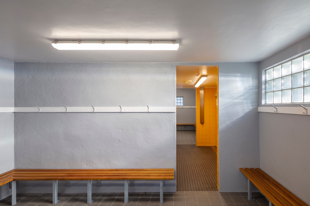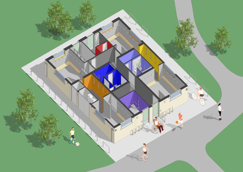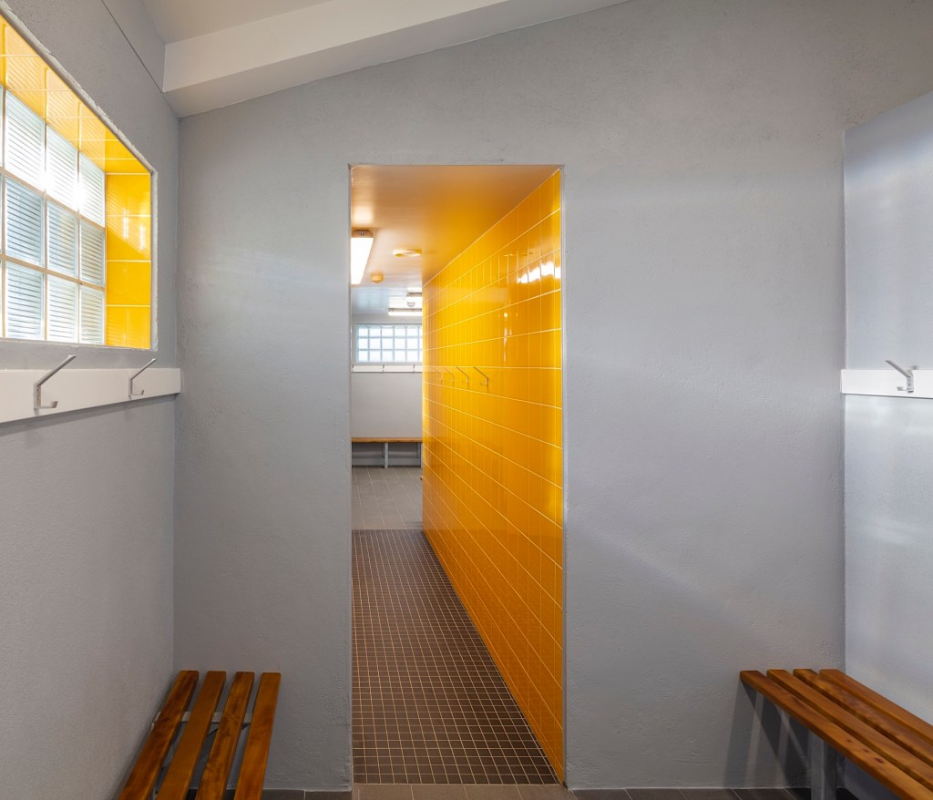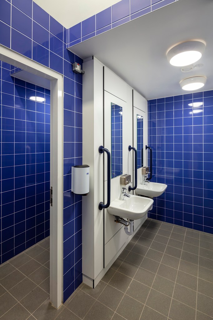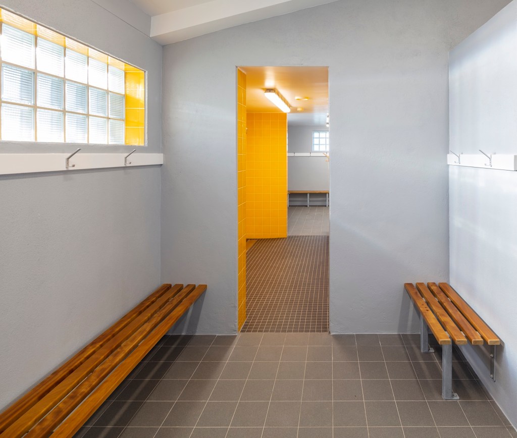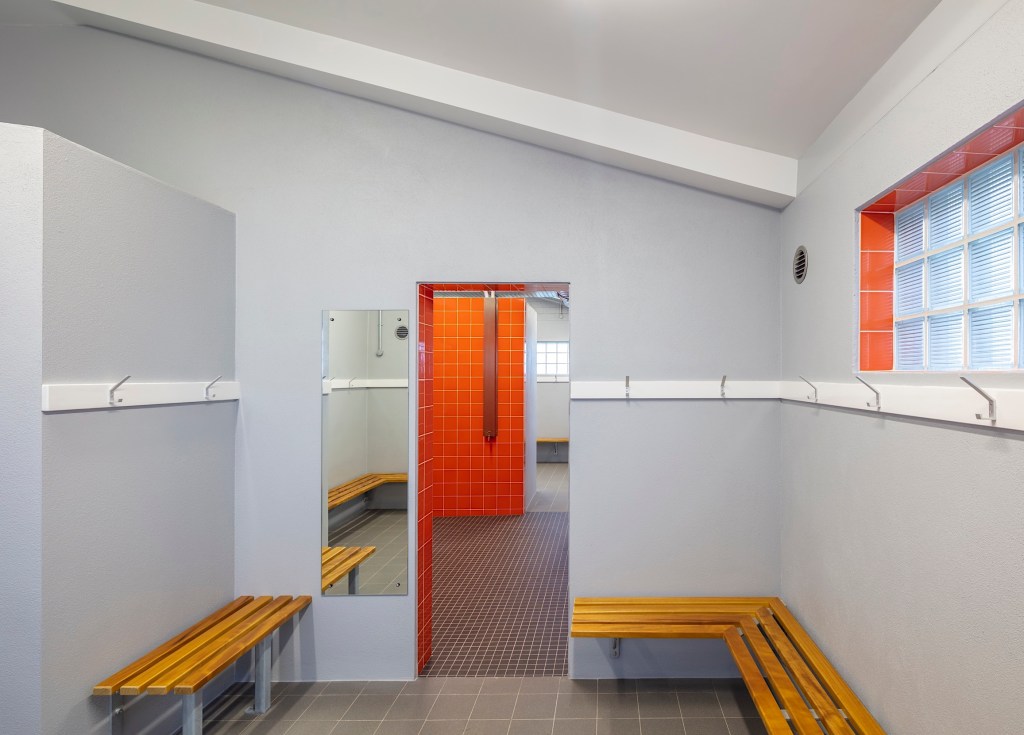 The existing building was extended to facilitate two pairs of changing rooms linked by shared showers; an accessible changing room, a referee room; toilets and storage. The circulation and changing rooms are finished in a neutral hard wearing grey colour in contrast to the lively coloured showers and toilets. The facilities are universally accessible.
