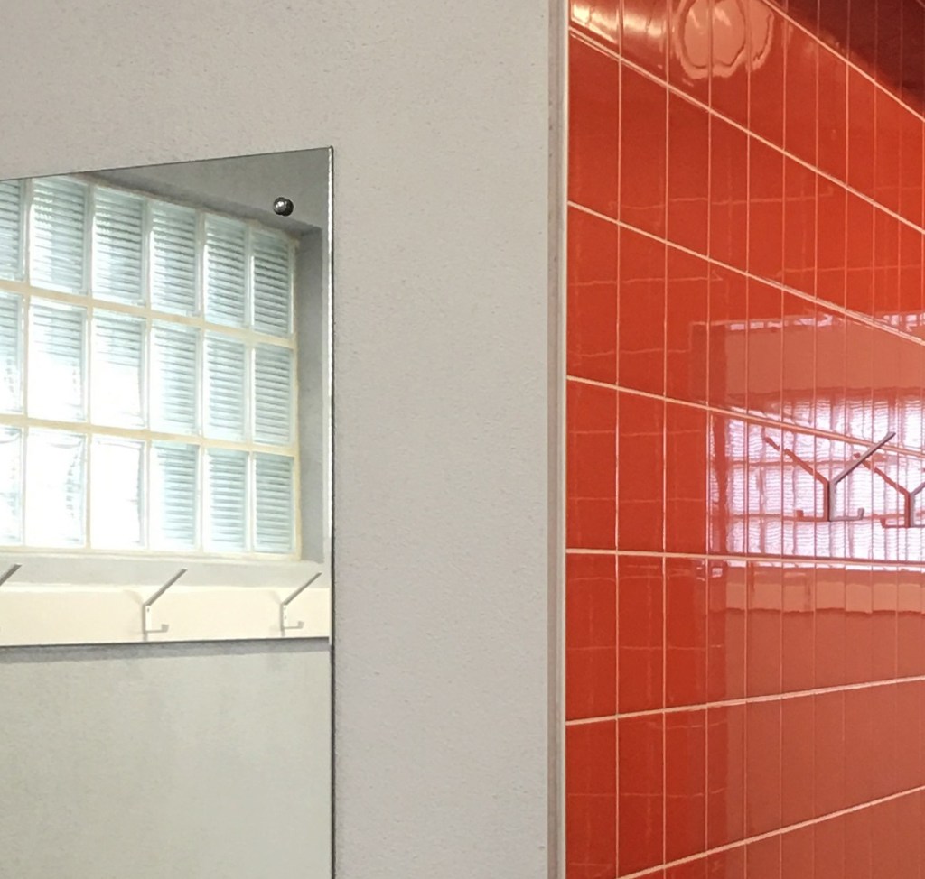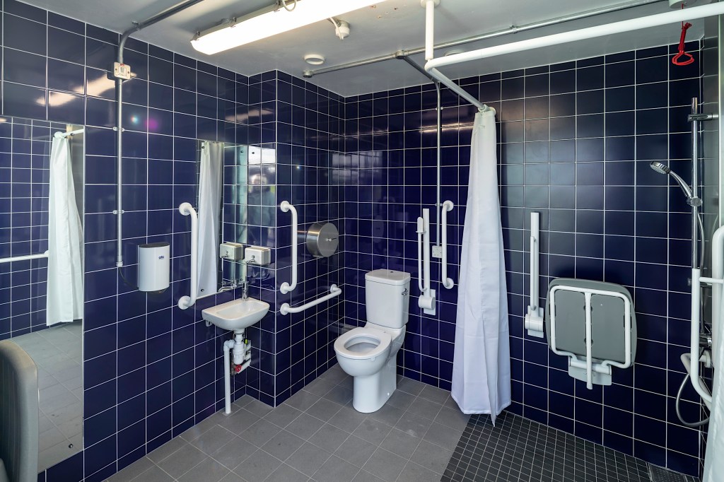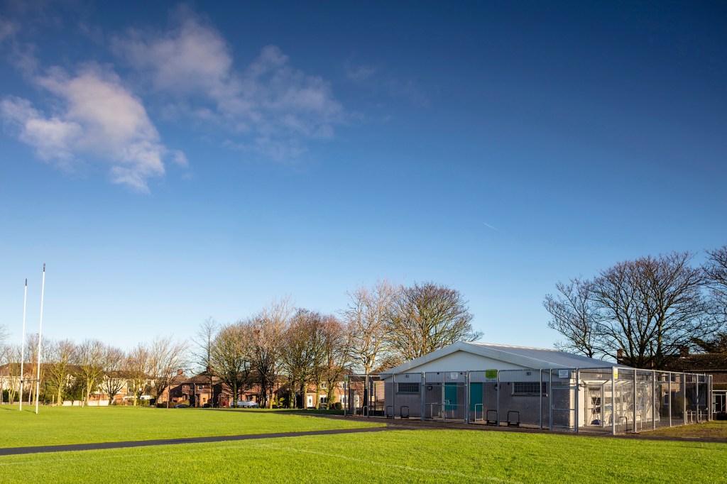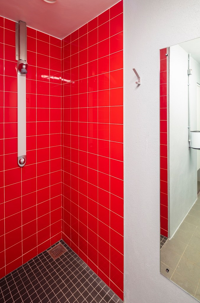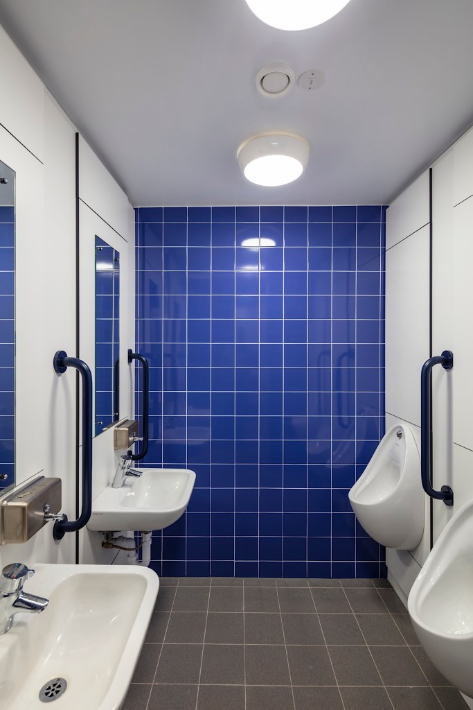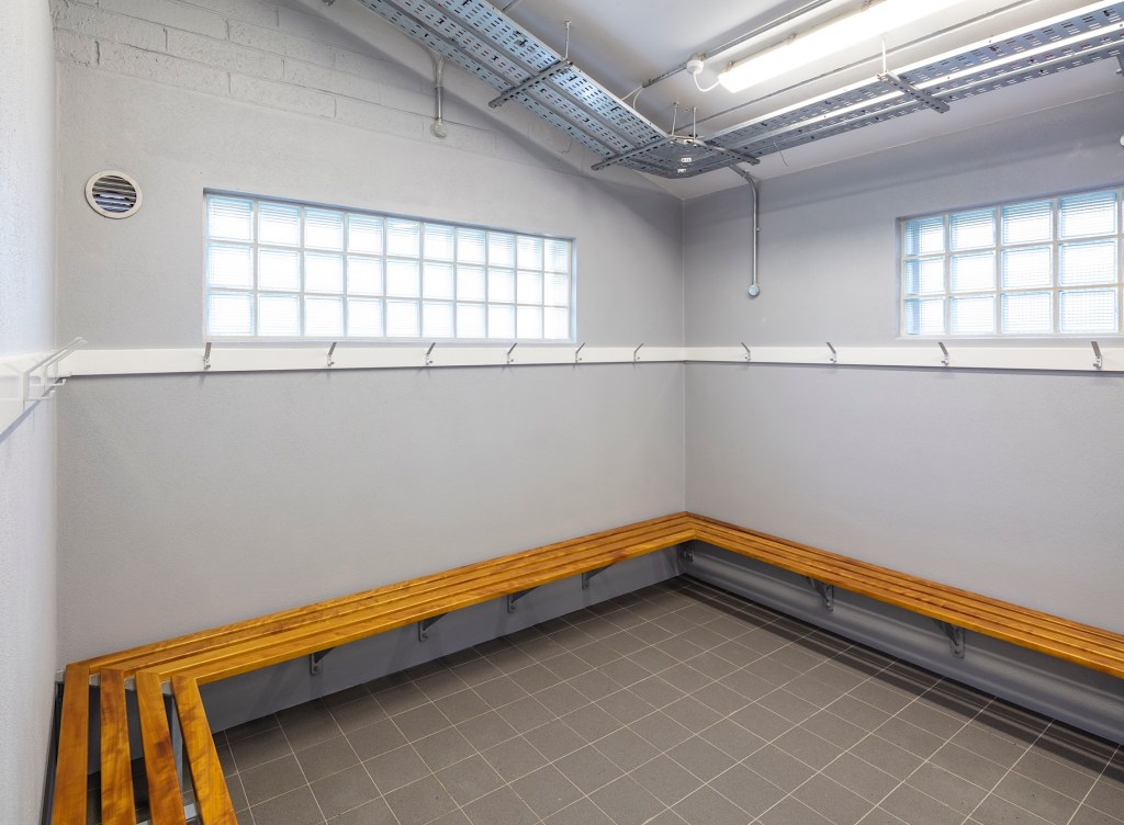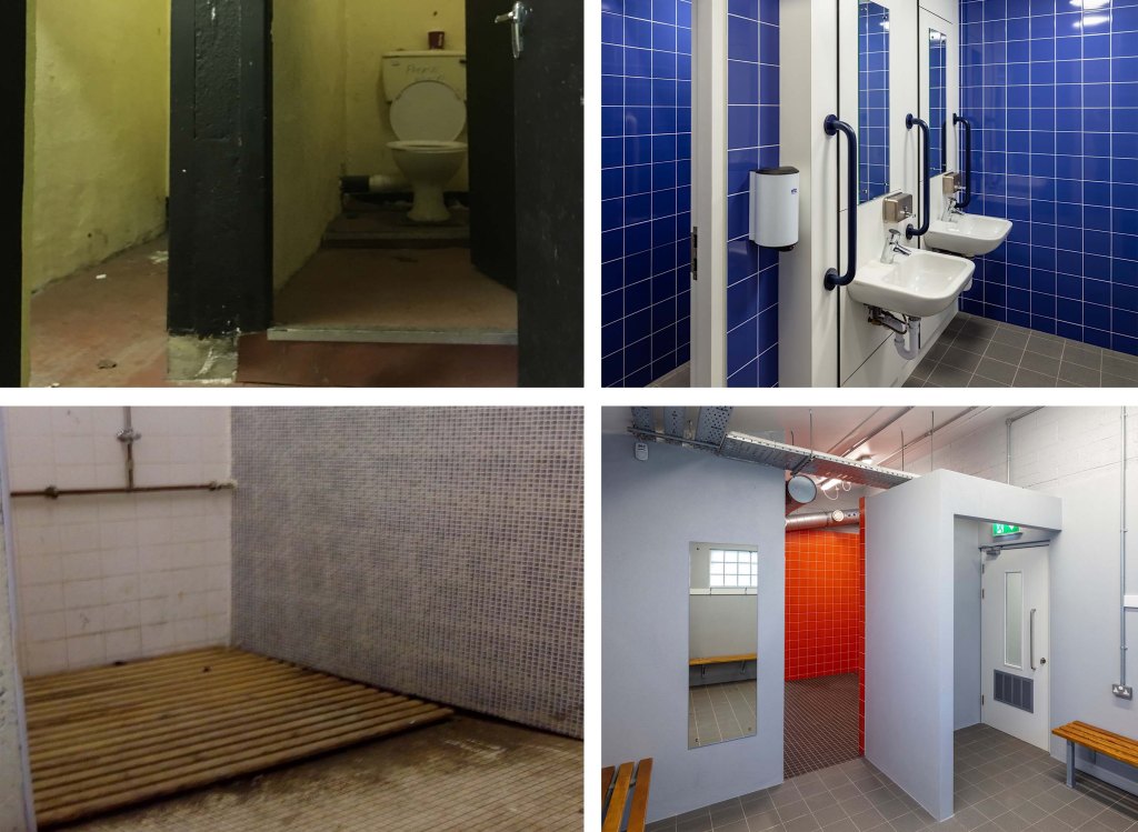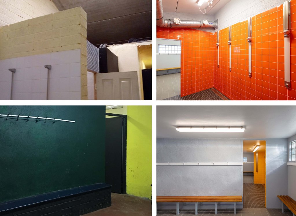 The existing building was extended to facilitate two pairs of changing rooms linked by shared showers; an accessible changing room, a referee room; toilets and storage. The circulation and changing rooms are finished in a neutral hard wearing grey colour in contrast to the lively coloured showers and toilets. The facilities are universally accessible.