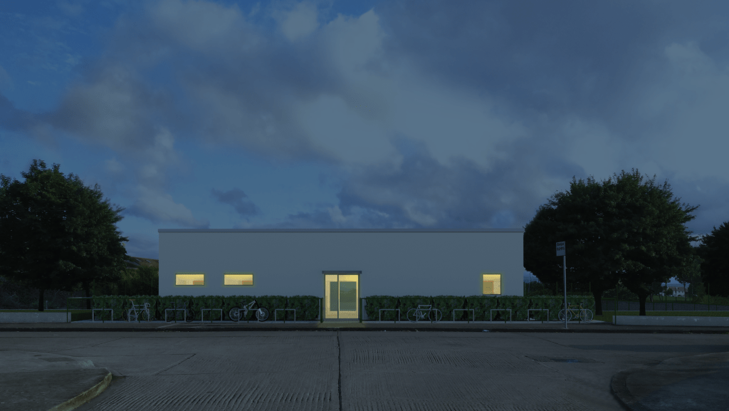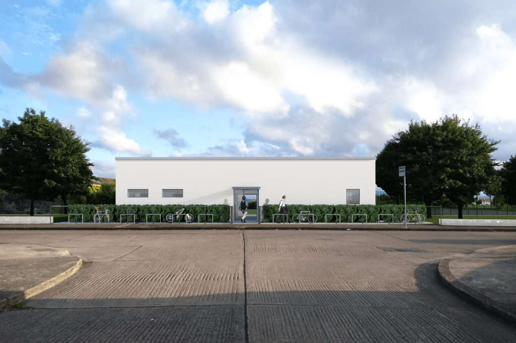 A new energy efficient tennis pavilion in Rockfield Park overlooking the new all weather tennis courts and football pitch.