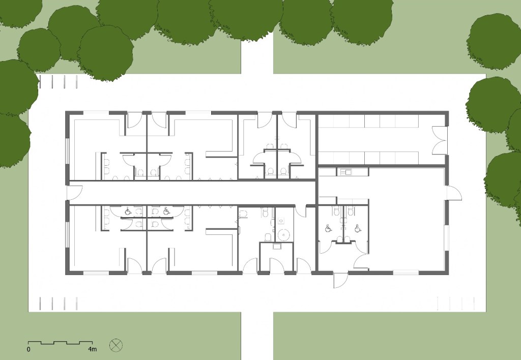 A metal roofed low lying linear building with a wrap around viewing area over looking the tennis courts. A central entrance with accessible male and female changing rooms with showers to one side and a generous club room to the other. Designed with sustainability to the fore; a simple and economic footprint, high thermal value construction, south facing glazing for maximum solar gain and energy efficient services will promote efficiencies to ensure minimal running costs.