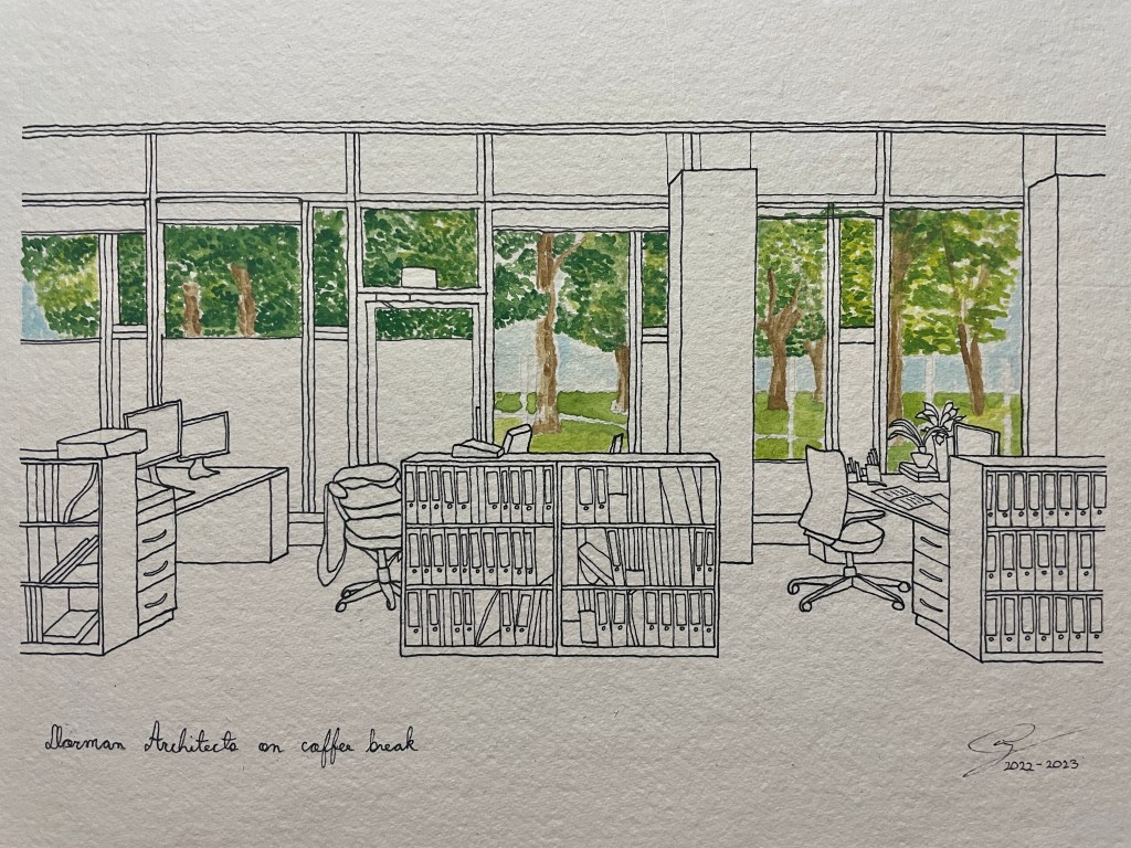 Farewell Christine-thank you for all your great work at Dorman Architects-we’ll miss you and we wish you well into the future. (drawing of ‘Dorman Architects on Coffee break’ By Christine Cruz)