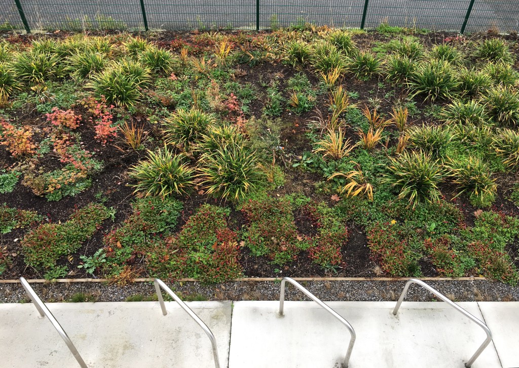 One particular feature of note is the rain garden where rainwater run-off feeds a natural garden planted with a mix of native shrubs, perennials and flowers. While on one hand it provides an attractive maintenance free natural landscape it also meets the council’s requirement for Sustainable Drainage Systems (SUDS) which has the objective of minimising the impact that the surface water run off from any development exerts on its environment by replicating, as closely as possible, the natural drainage from the development site before the development is carried out.