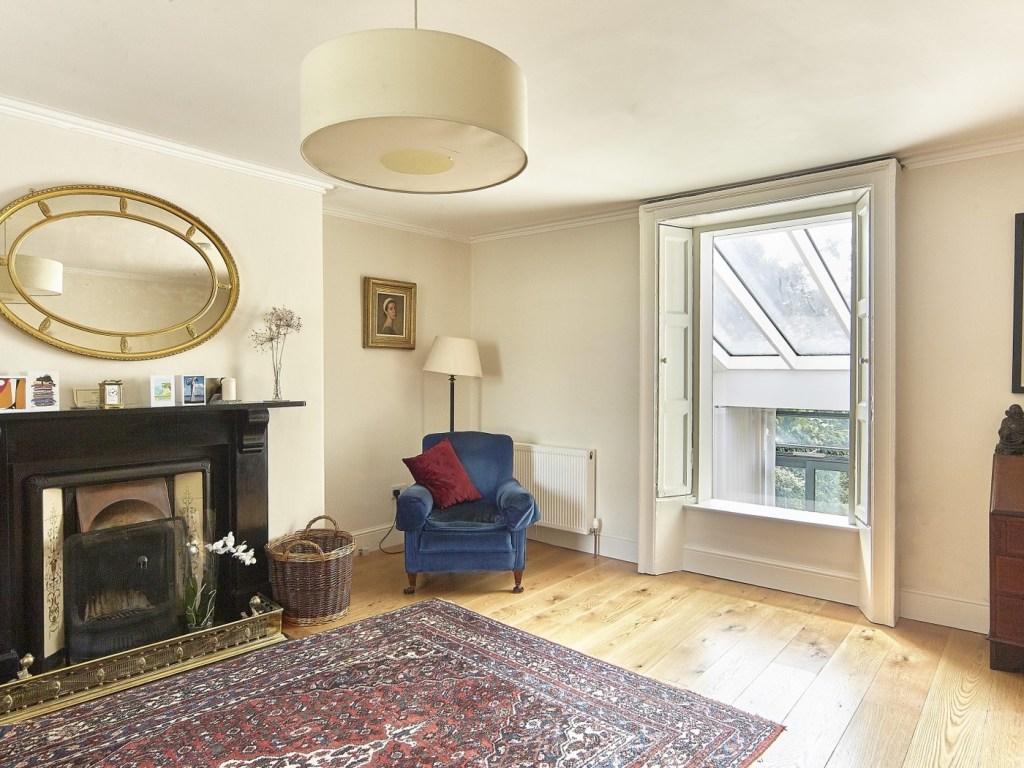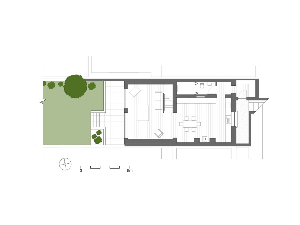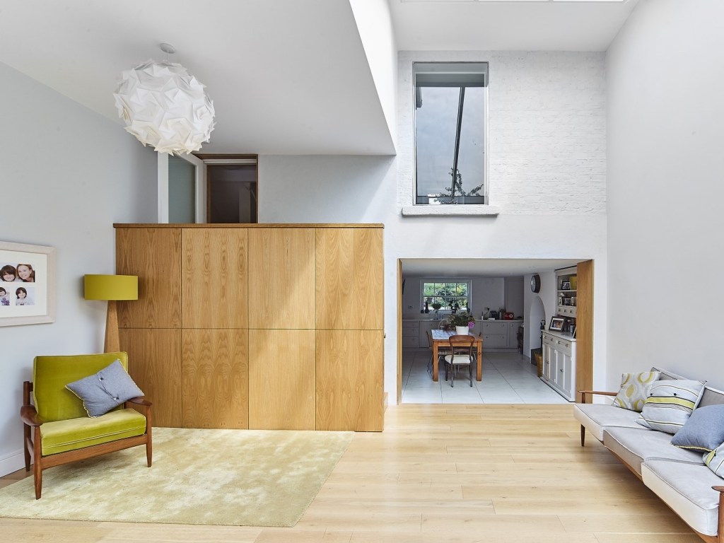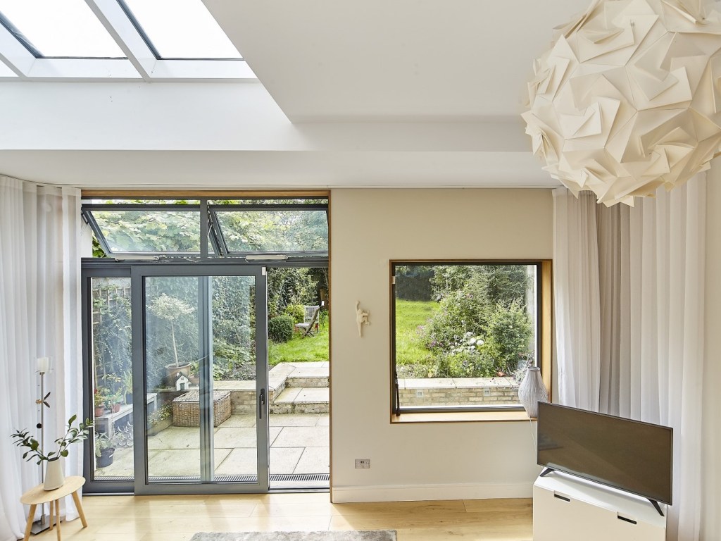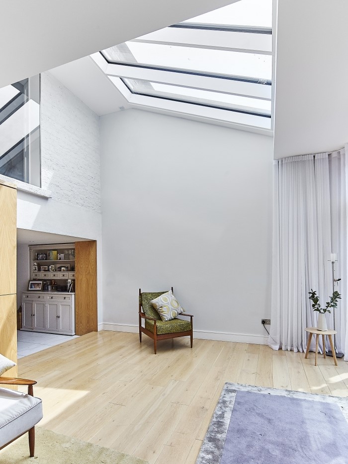 The infill extension’s roof is virtually fully glazed which floods the low ceiling kitchen with natural light whilst maintaining views to the garden from the upper level reception room. Large glazed doors open out onto the garden. The infill extension’s roof is virtually fully glazed which floods the low ceiling kitchen with natural light whilst maintaining views to the garden from the upper level reception room. Large glazed doors open out onto the garden.