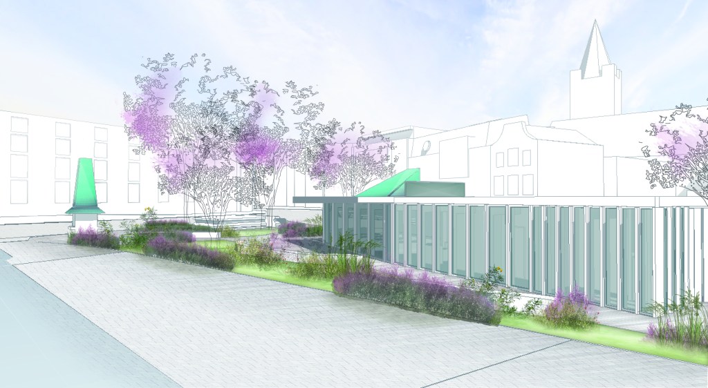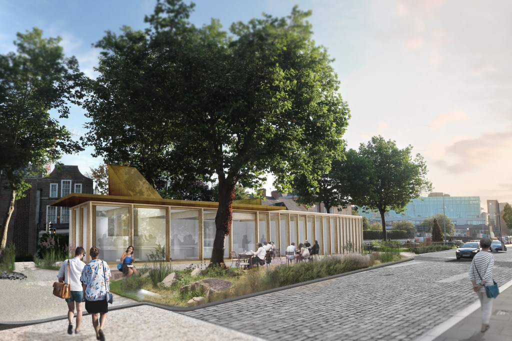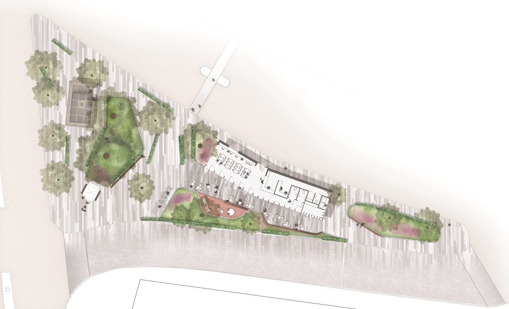 The take-away kiosk with its arresting bronze ‘top hat’ acts as a signifier to those approaching from the south. It is intended to serve the needs of passers by and those using the park.