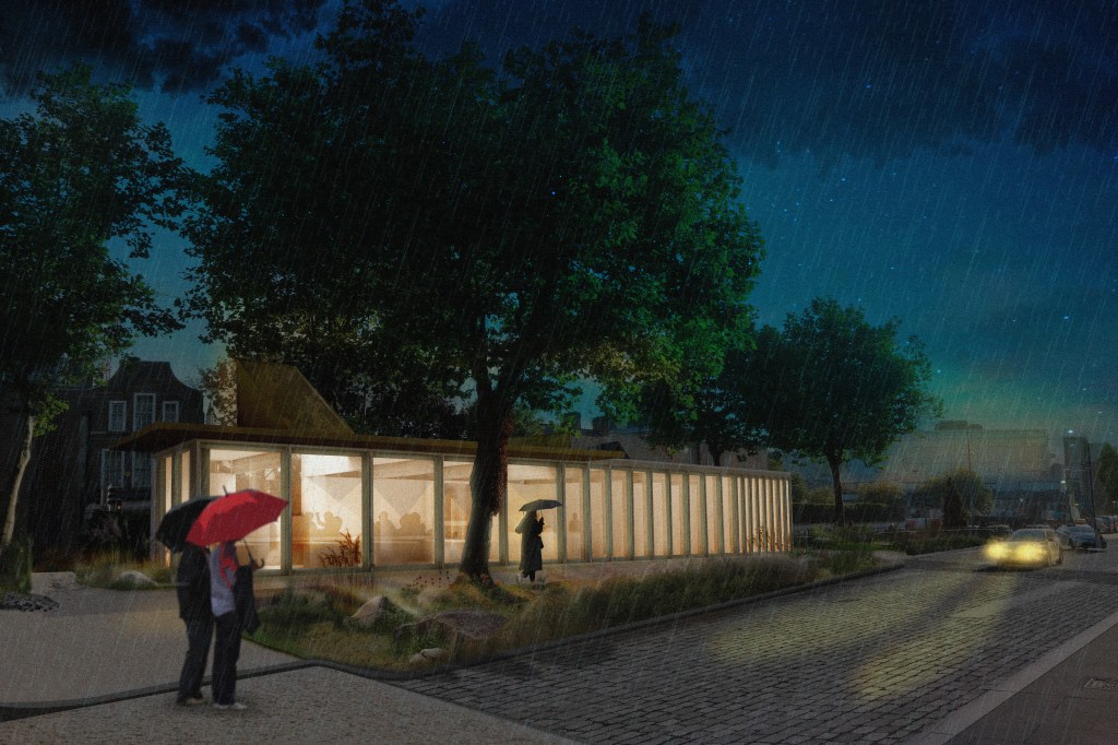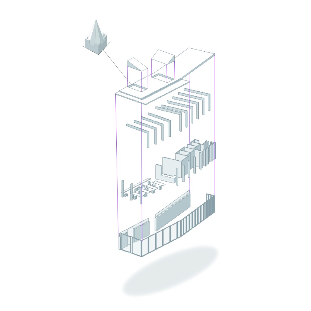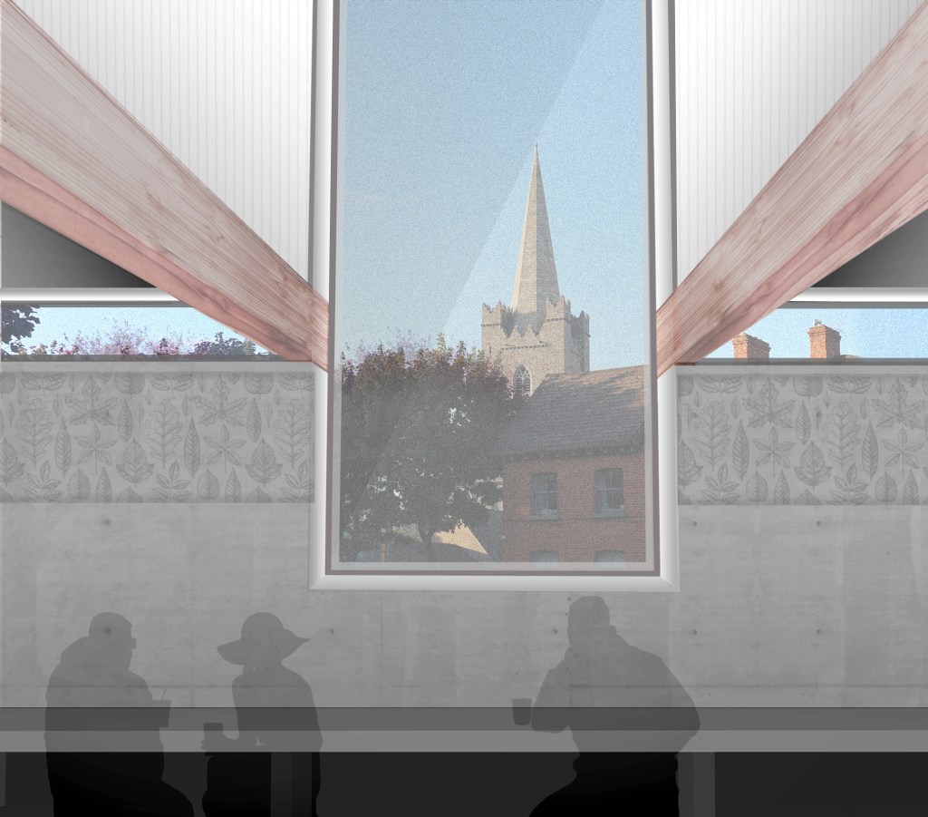 A design competition for new tea room on a small pocket park in Dublin at the junction of Kevin Street and New Street, once known as ‘the four corners of hell’. The project re-imagines the whole island park as a single entity with three distinct pavilions: the Edwardian Toilets, the Tearoom and the Kiosk.