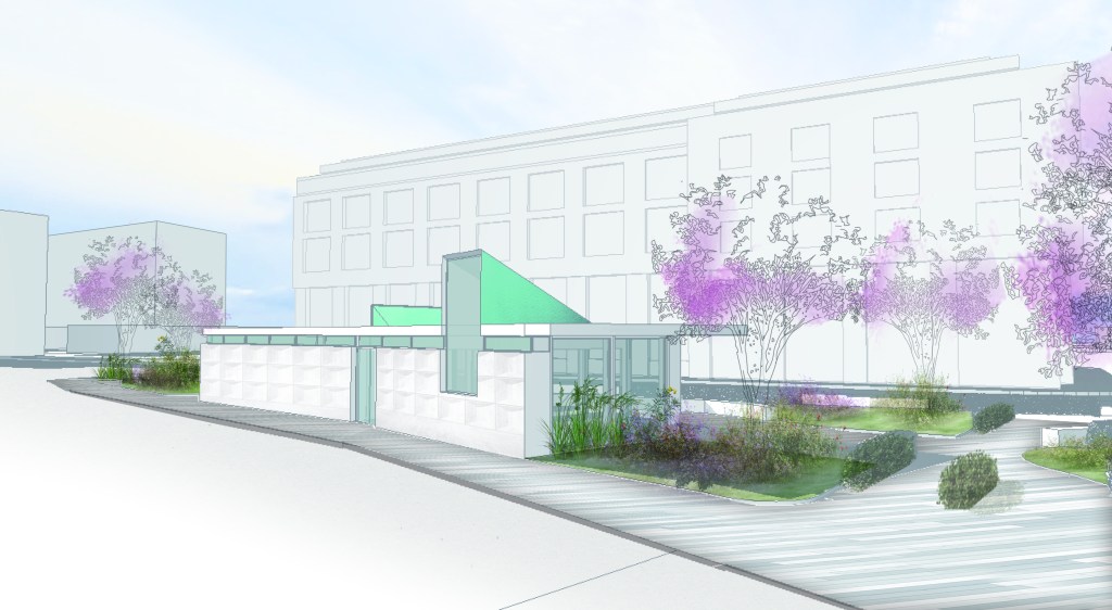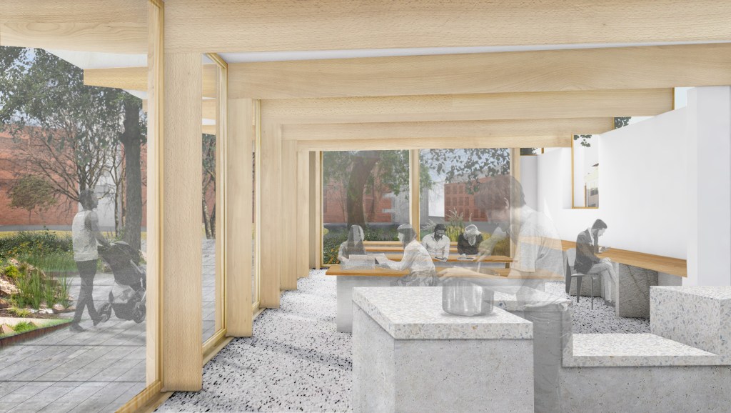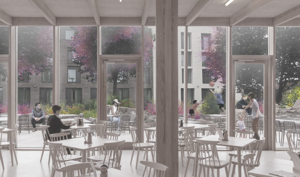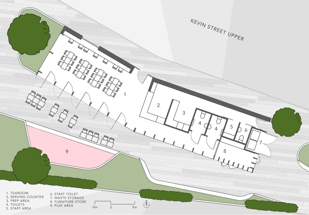 The tea room, a narrow linear building, presents a near solid barrier to the noisy traffic choked Kevin Street. The tall, bright and airy volume of the tearoom provides a welcoming vibrant space with a strong visual connection to park. Tall pivot doors open out onto the quieter outdoor terrace overlooking the play area. The tea rooms are imagined as a warm and welcoming place away from the hustle and bustle of the surrounding streets. The west gable faces onto a richly planted area of tall grasses and flowering plants.